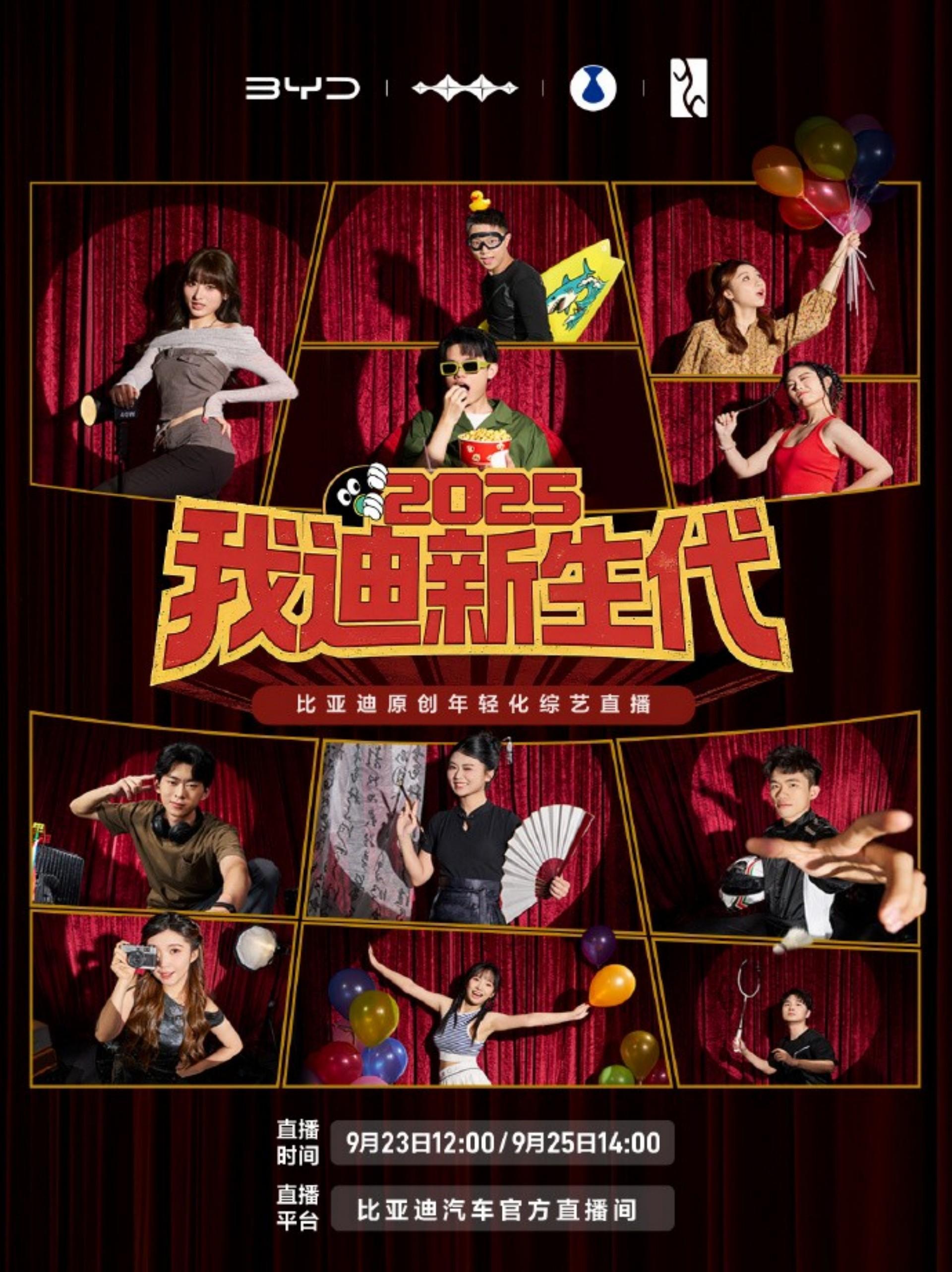 9月23日,《我迪新生代 2025》在比亚迪汽车官方直播间进行直播,这是该原创年轻化综艺第三年举办。