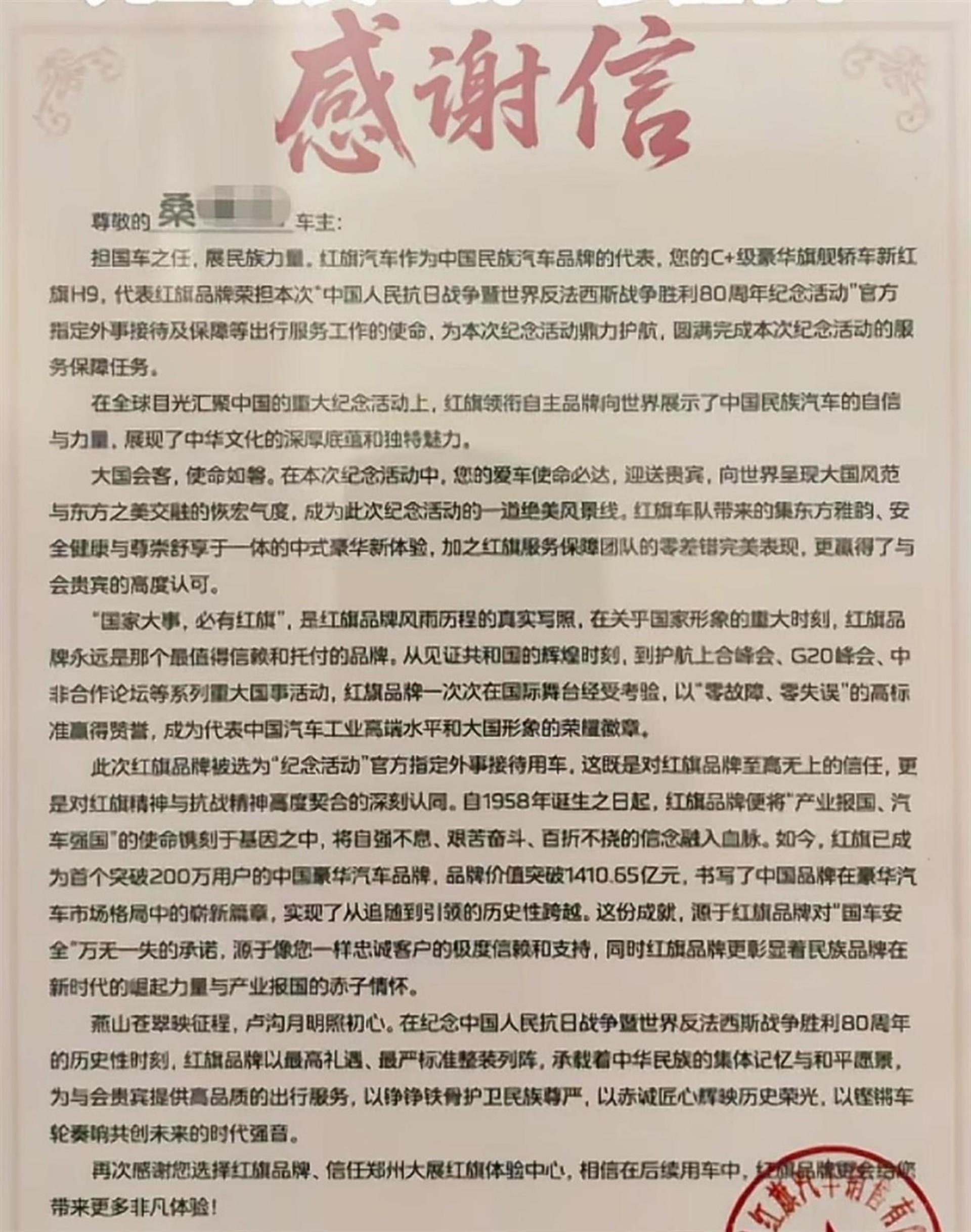 感谢信写道:“大国会客,使命如磐。在本次纪念活动中,您的爱车使命必达……成为纪念活动的一道绝美风景线。”