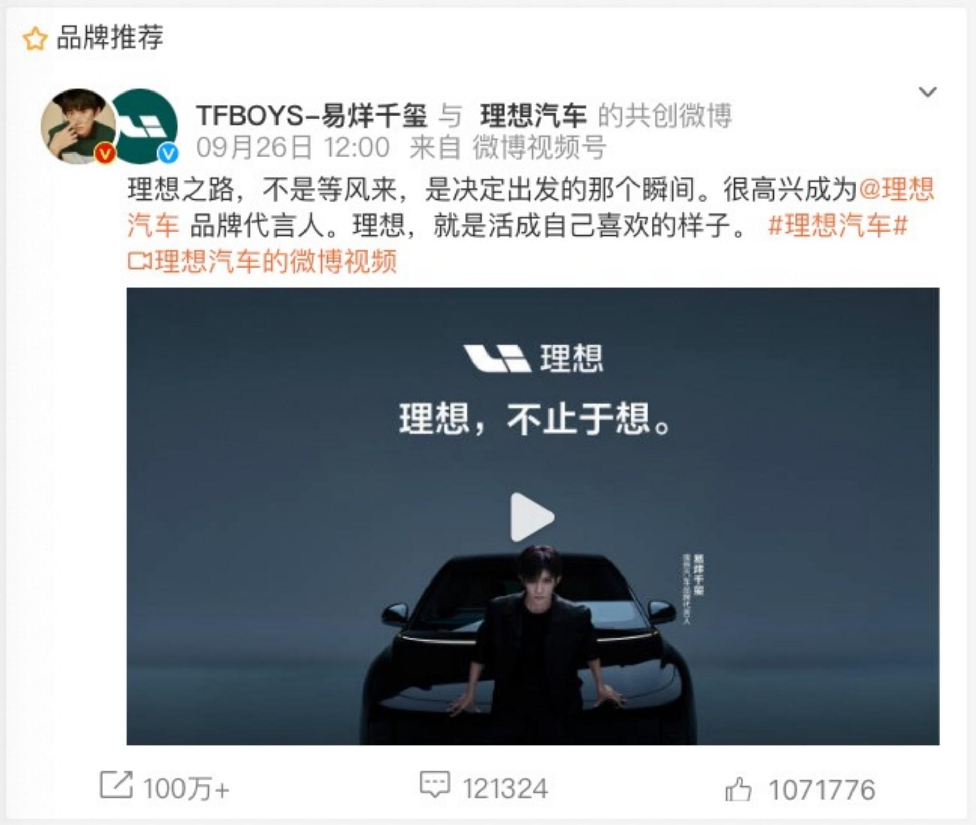 9月25 日,理想汽车官方微博发布一张神秘剪影海报,宣布首位品牌代言人即将揭晓,引发全网猜测。24小时后,易烊千玺与当天上市的纯电动SUV理想i6 同时亮相,正式官宣合作。