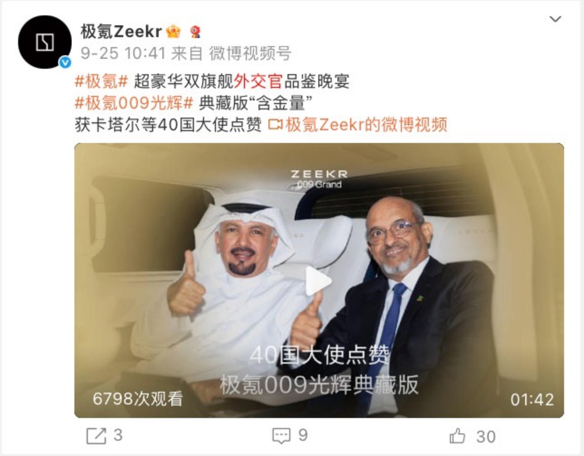 9月19日,极氪举办“全球首次新能源豪华汽车外交官品鉴会”,来自卡塔尔、沙特、科威特、阿联酋、阿曼、印尼等 40 国的驻华大使共同体验极氪9X与极氪009光辉典藏版。