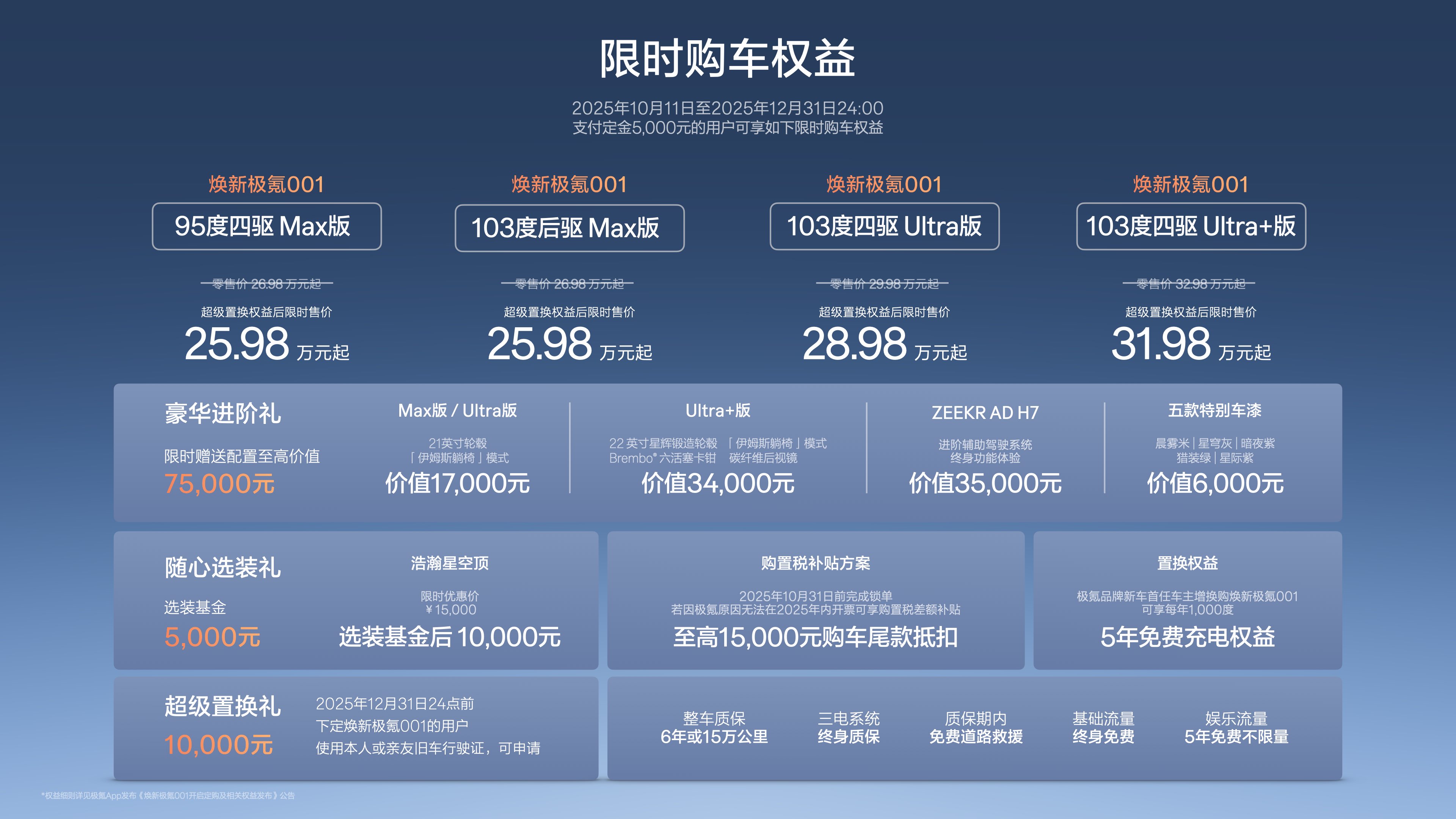 10月11日,豪华猎装轿跑焕新极氪001正式上市,官方零售价26.98万元起,超级置换权益后,限时售价为25.98万元起。即日起,用户可通过极氪App、官网、小程序及全国极氪门店等官方渠道预订。