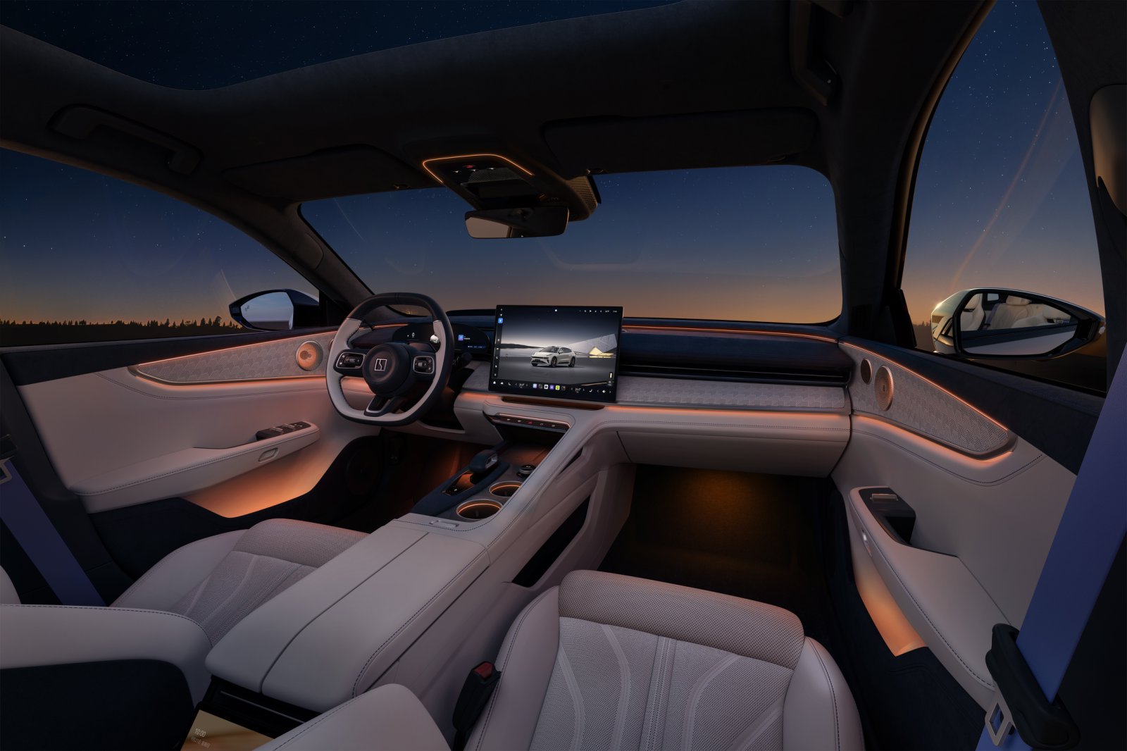 全球首发的“浩瀚星空顶”,在LV分区调光天幕中嵌入了500颗独立星粒,厚度仅增加1毫米,不影响空间与视野。用户可一键点亮专属星座,配合迎宾、节日彩蛋等场景模式,将每次出行变为与星空的浪漫对话,同时具备87%的能量隔绝与近100%的紫外线阻隔能力。