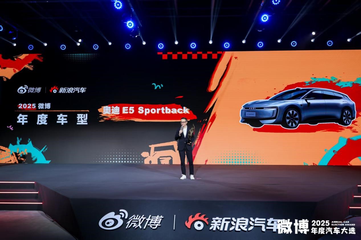 而基于此,立足当下用户需求的变化趋势,根据微博网友在智驾、座舱、设计、性能等方面的内容提及度,结合微博大V推荐、网友投票权重、核心评委打分权重,综合评议,微博年度汽车大选评选出2025微博年度智能辅助驾驶车型、2025微博年度座舱车型、2025微博年度设计车型等等。此外,综合车型在微博平台的热点、用户功能点讨论、专业质价比、社交传播与互动等多维度的声量表现,综合销量的突破性表现,经行业专家评委的综合推荐最终评定,奥迪 E5 Sportback,荣获2025微博年度车型。