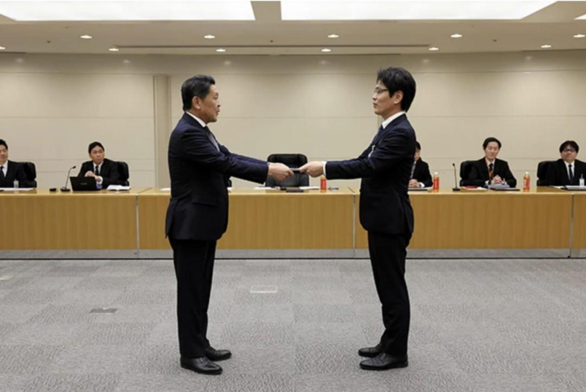 2月12日,本田汽车公司副总裁青山真司(左)听取本田汽车工会提出的要求