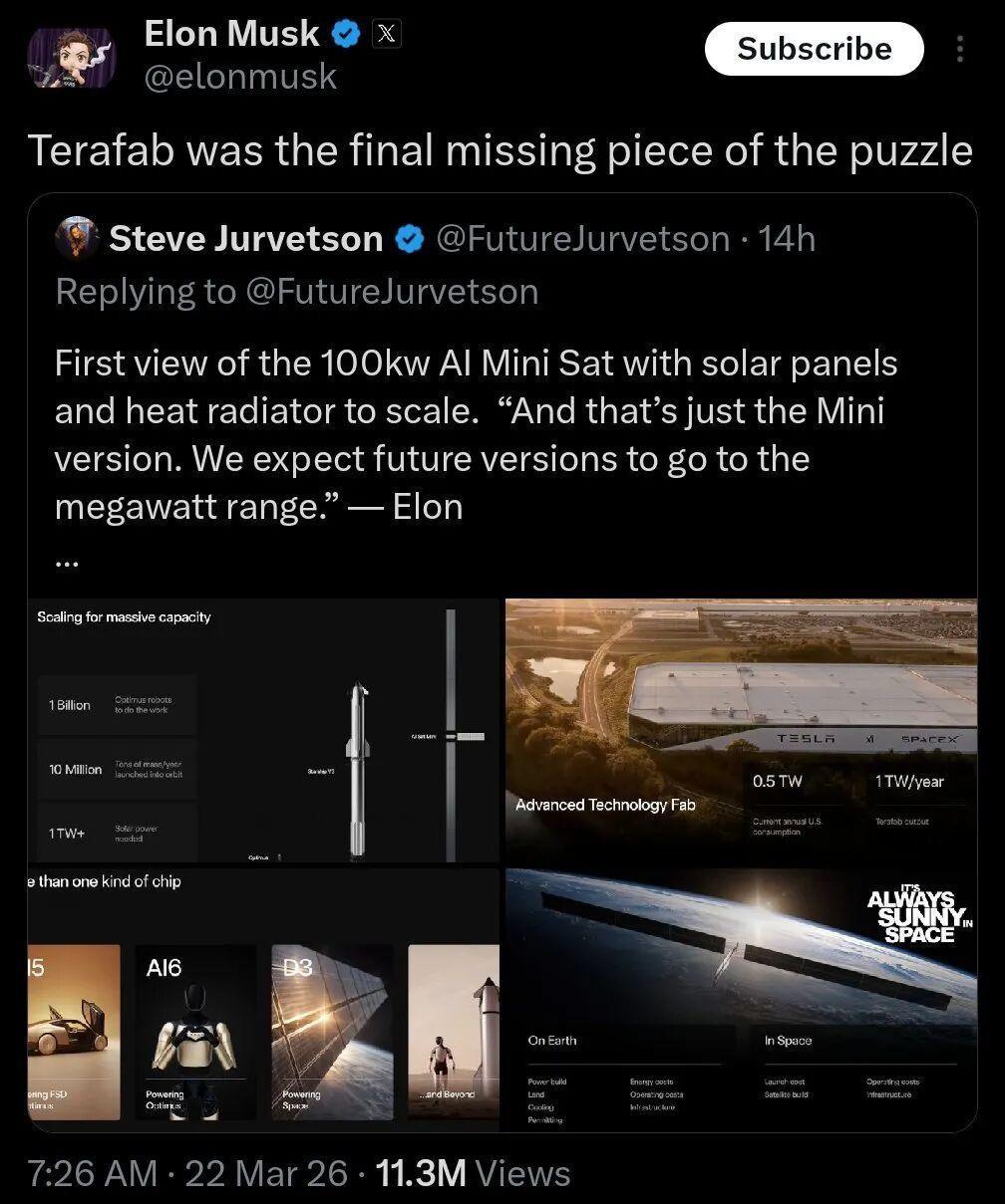 此次发布会上马斯克提到的太空维度又增添了一层Terafab项目的意义。