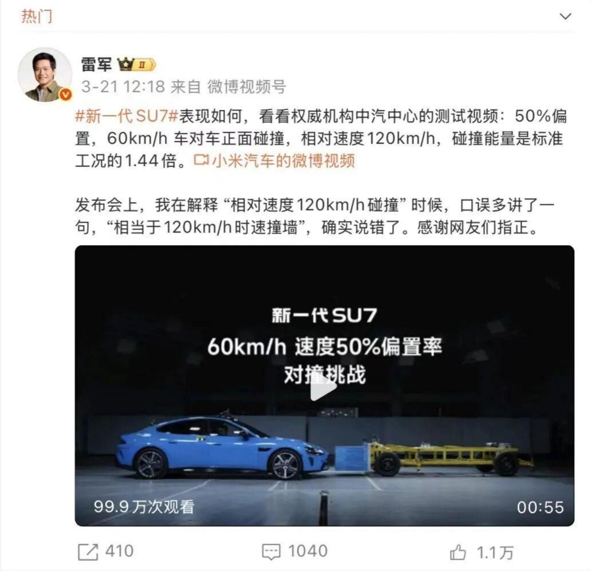 在这场发布会中,小米汽车企图与雷军松绑的意图较为明显。遗憾的是,在阐释中,雷军发出“两辆小米SU7以60km/h正面相撞,相当于120km/h时速撞墙”的言论,再次引发网友的质疑。