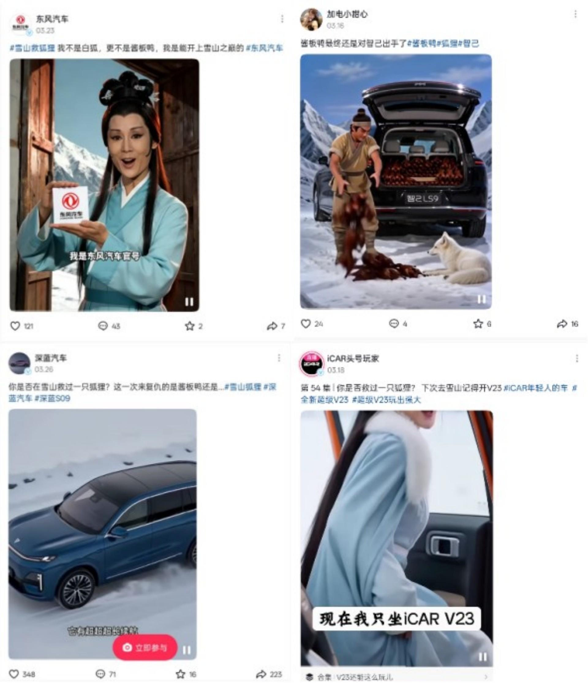 车企们不止要在活动差异化上下功夫,还要迎接已然到来的AI二创热潮:前脚《哪吒2》“这是什么”的视频二创热刚过去,后脚“雪山救狐狸”爆改潮又来了。